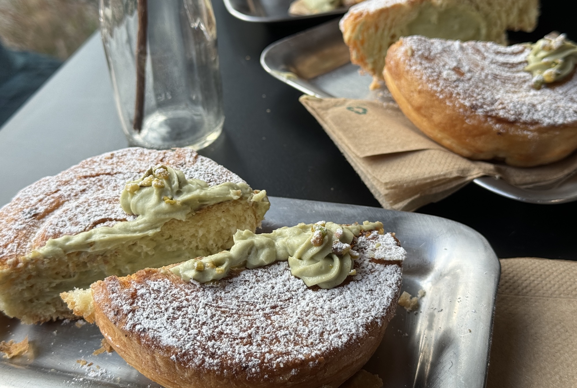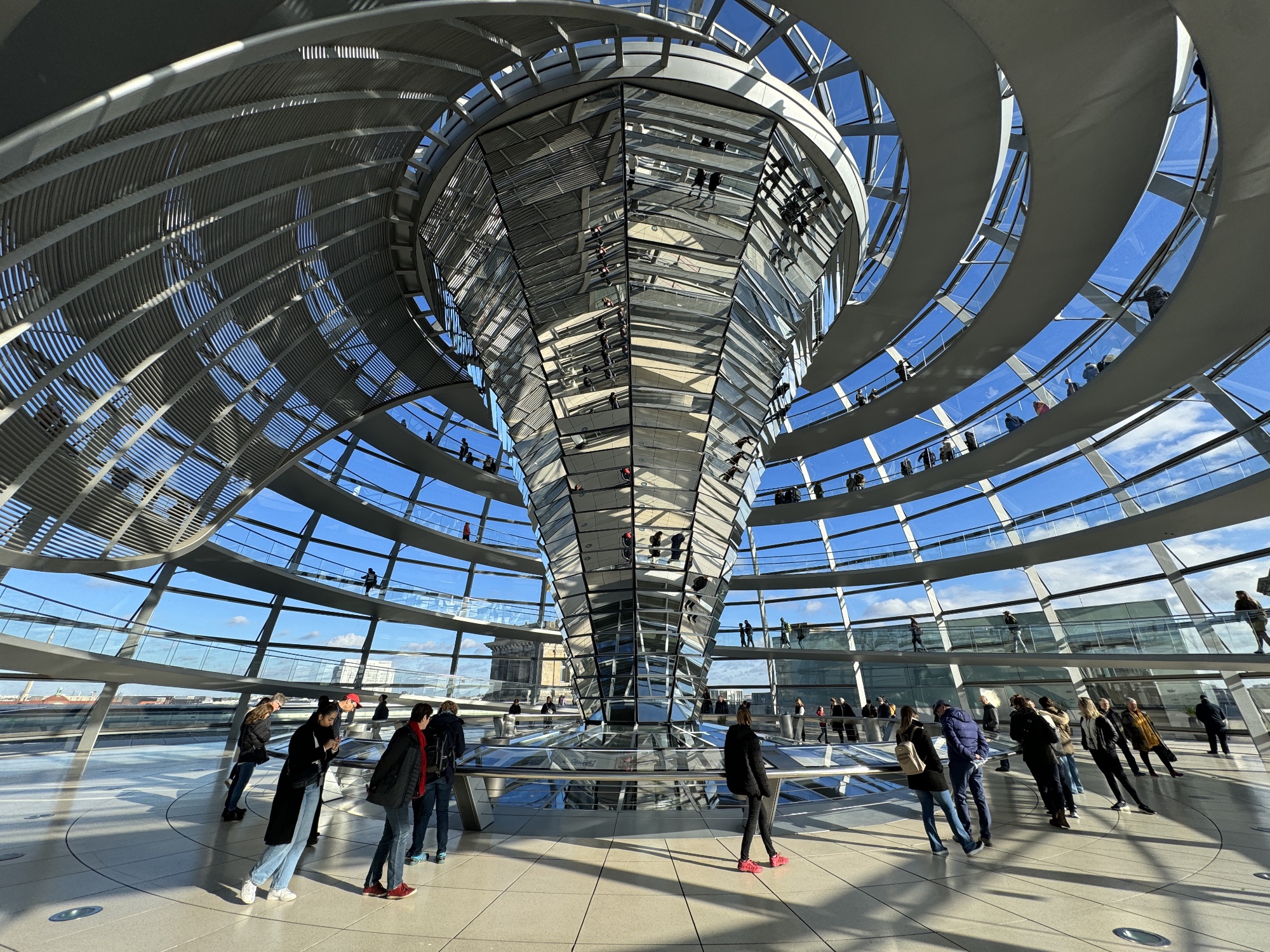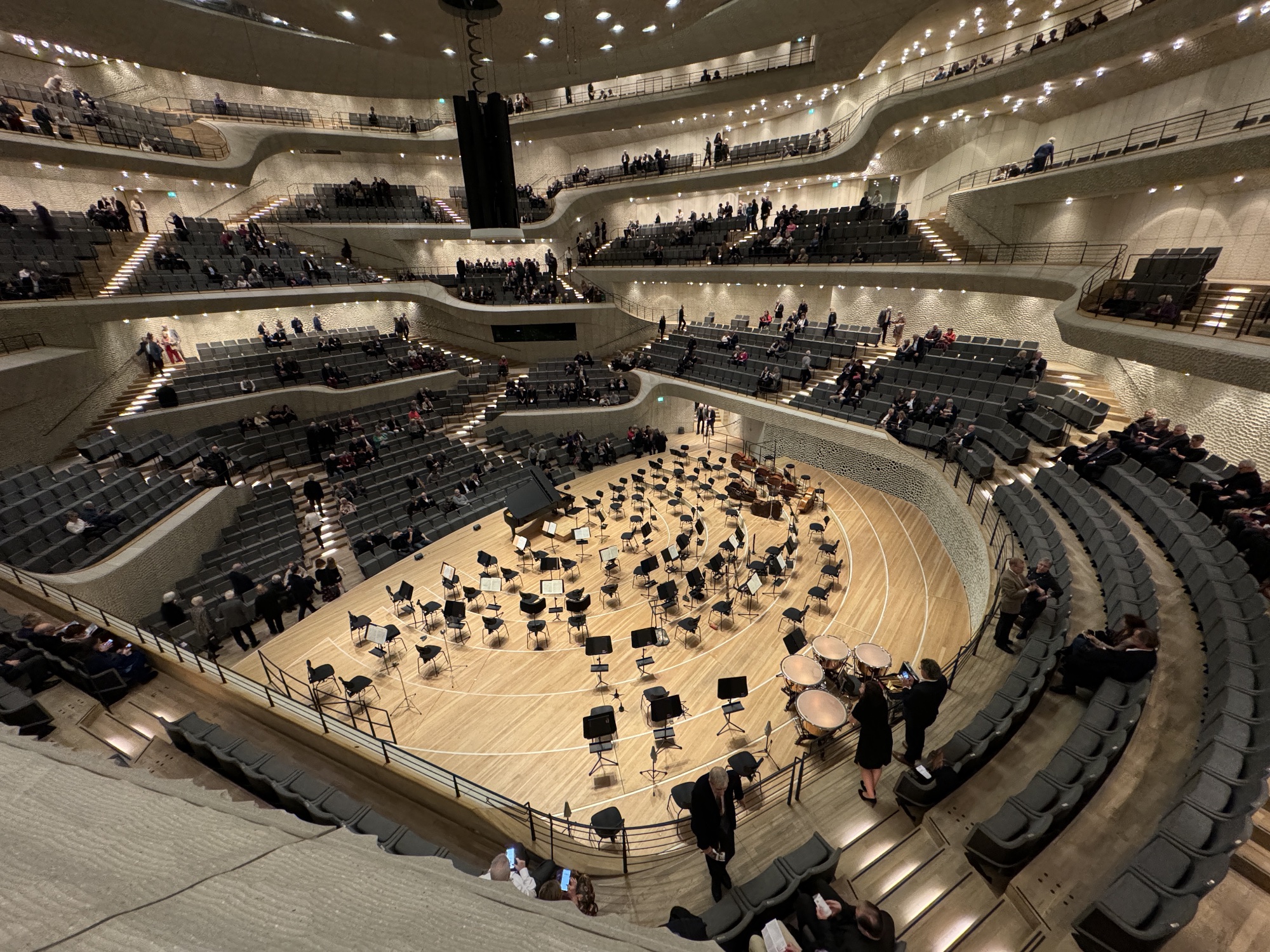 The Reichstag was a pain in the ass to get into, but an architectural revelation, especially the glass-and-steel dome on top (next). In this shot I love the smoothness of the clear blue sky and the cold look of the stone contrasted with the vibrant German flag.Glass, mirrors, and a dual-spiral ramp to reach the top of the dome… one of the architectural highlights of our trip. The symbolism of the Reichstag’s design was also noteworthy — the idea being that lawmakers would always work with full transparency to the public, never hiding what they do, unlike in prior German periods that led to global tragedy.Food in Berlin was noteworthy, too, including this fully vegan bakery with treats that were shockingly good. When it’s gluten-free or vegan I’m prepped for an often-lackluster experience. Not with this flakey pistachio cream number.Berlin’s Hauptbahnhof was a multi-layered engineering marvel, with trains above and below you at multiple levels, criss-crossing in every cardinal direction. The red train in this photo was on top of the shops, people, and at least two more layers of tracks below the main concourse. Aside from the sheer number and arrangement of tracks was the shocking number of arrivals and departures running across all those tracks, all day long, just minutes apart. The daily operation was as impressive as the engineering and architecture.This photo is not distorted — the balcony of the Pierre Boulez Saal is deliberately warped as part of its innovative theater-in-the-round oval architecture. We’d never seen anything like it. And we experienced the most fascinating and beautiful concert of our entire tour in this theater. Fun fact: I bought the tickets last-minute using the satellite Internet connection we had while flying over the Atlantic.
