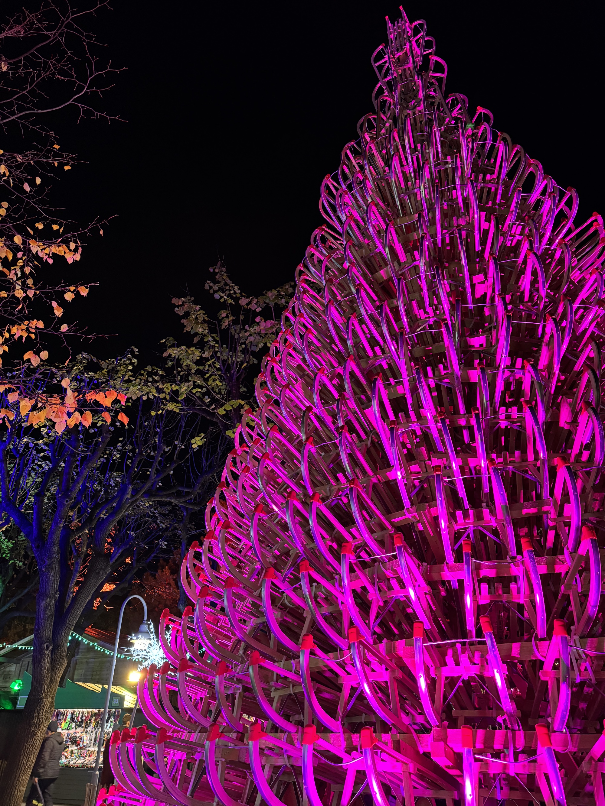 While on a food tour in Vienna, we got to see a truly local open-air market, where residents routinely go to get their produce. Each of the sellers buys from a major grocery distributor at wholesale and turns the produce around to sell it retail in their market stall — but at a price well below commercial grocery retailers. So if you want produce in Vienna, go to your local street market, not the formal grocery store. Lucky for residents, these markets pop up all over the city multiple times per week.We were disappointed with the price/performance ratio at Vienna’s Musikverein, home to the Vienna Philharmonic and lots of other orchestras and groups. (The price was high, but the quality of performances was moderate at best and the audio quality in the hall was the worst we experienced in Europe.) But at least they use the money they collect to maintain a remarkable historic facility, including detailed gold inlay architectural elements throughout. It’s just ironic this world-renowned music hall’s best feature is visual.Contemporary train stations are my catnip, and while Vienna’s was not as impressive as Berlin’s, it was still a beautiful and efficient facility.While in Vienna we visited one local Christmas Market that had just opened, an Austrian tradition each year. The market was fine, but this pink-lit Christmas tree made entirely out of toboggan sleds was truly impressive.It was great to see an opera—Mozart’s Magic Flute—in the historic Wiener Staatsoper hall, from a box seat, no less. This was expensive and… it was fine. We saw the “B” team, or maybe even the local “C” team in the performance. I suspect some truly amazing operas are performed here, but this wasn’t one of them. But again, the facility was historic and impressive.The exterior of the Wiener Staatsoper is lit up beautifully at night. Architecture is one of Vienna’s biggest draws, and it doesn’t disappoint.One of the most-photographed cathedrals in the world shows off the good stuff in bright sunlight against a clear blue sky. We only got one clean shot like this of St. Stephen’s the entire 5 days we were in Vienna, which isn’t surprising, given it was mid-November.The St. Francis of Assisi church, northeast of District 1, was a surprise. It’s complex, hulking gothic mass was topped with striking red cones and oxidized copper accents. Completed in only 1913 it wasn’t in as good a shape as other longer-standing churches. But striking nonetheless.