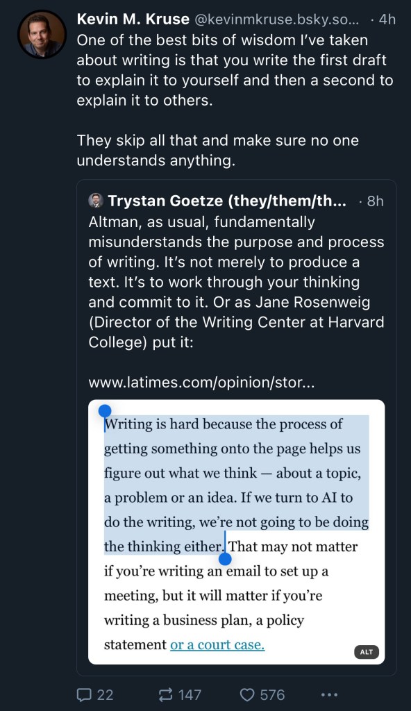 This recent post on Bluesky, referencing an LA Times opinion piece, really captured my thinking about where writing and AI intersect for most folks out there, whether they know it or not.