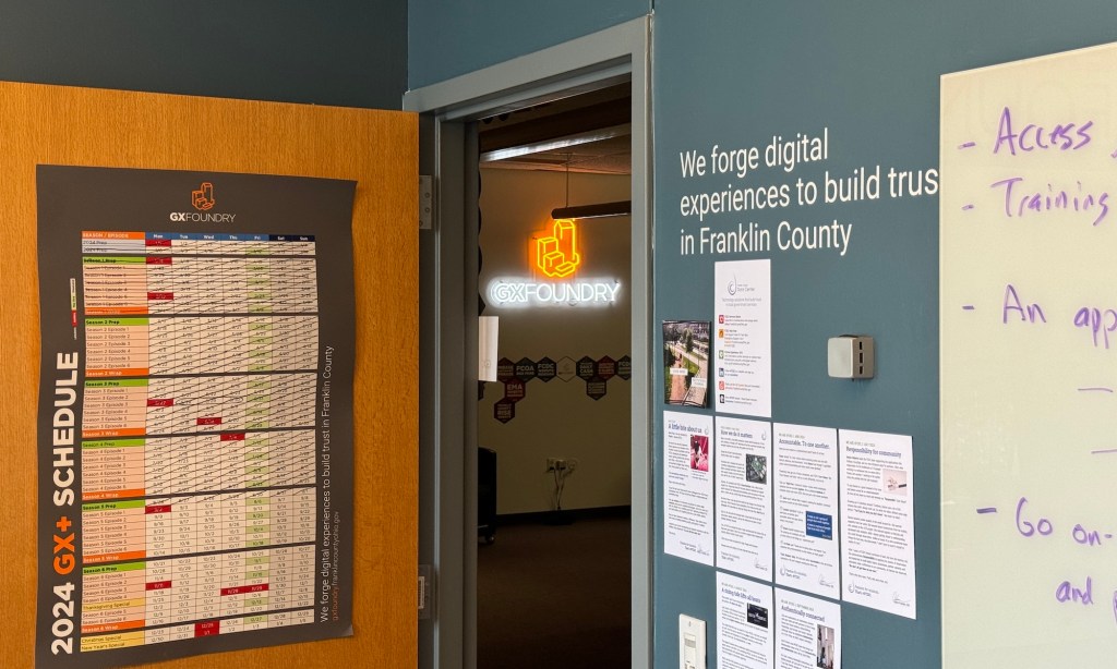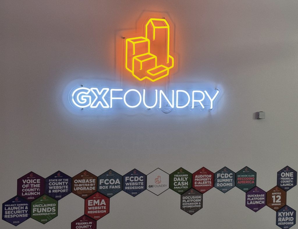 First, we finally (FINALLY!) mounted our neon-style LED sign for the GX Foundry in our office. I bought the sign in late 2023 and we waited months for our facilities group to help us mount it. They failed to engage with us for over 9 months so we took care of it ourselves. The credit for the clean mounting really goes to Aaron Szabo, our designer, who has a lot of experience with building and mounting branding elements like signage, conference displays, and more. Aaron also developed the GX Foundry logo in 2022-2023.