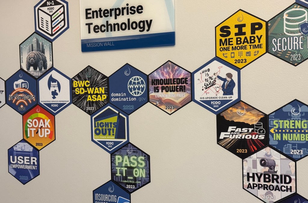 Below is a shot of the Enterprise Technology Mission Wall, with tons of 2023 mission patches to get them started. This grouping represents a bunch of teams that work in multiple infrastructure disciplines and support: