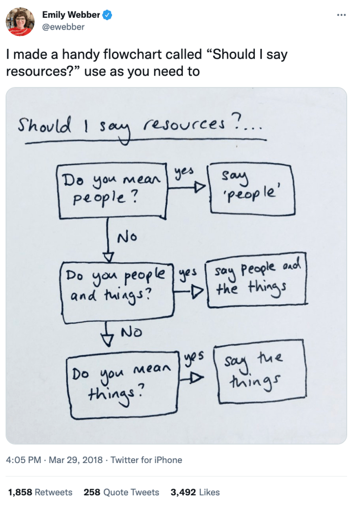 - Through some Bluesky interactions, I stumbled across this 2018 piece by UK digital thinker Emily Webber: Should you call people resources? Spoiler alert: No. She makes a good case, and it dovetails with a change we made in my organization this year. We don’t have a “Human Resources” team anymore. Now we have a “People Experience” team, because they are focused on the experience employees have as they work in our organization. Yes, they are still legal guardians of the organization when they need to be, but they lead with thinking about experience from the employee’s perspective first.