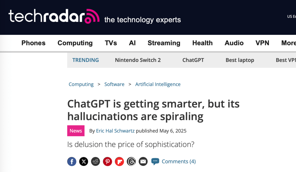 But we’re on the hype curve, baby, and marketing is all we’ve got! This hallucination problem must be fixed because they can’t sell us “agents” until we can trust those agents to be autonomous. So that’s what the AI companies will do next—add more processing, more layers, more algorithms, more checks and adjustments and filters. The reasoning models will improve with time. But they will always have worse hit rates than baseline LLMs.