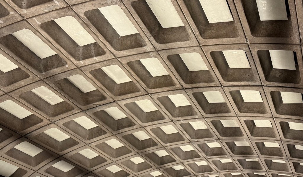 Denizens of DC will recognize this brutalist concrete pattern. It’s the ceiling of a major Metro station in Washington and one of my favorite bits of 20th century architecture. Deeply functional and useful, with a repetitive monolithic pattern. It hints at the gridded nature of the city and helps convey motion through space in a transit system that’s entirely underground. And it always makes me look up.